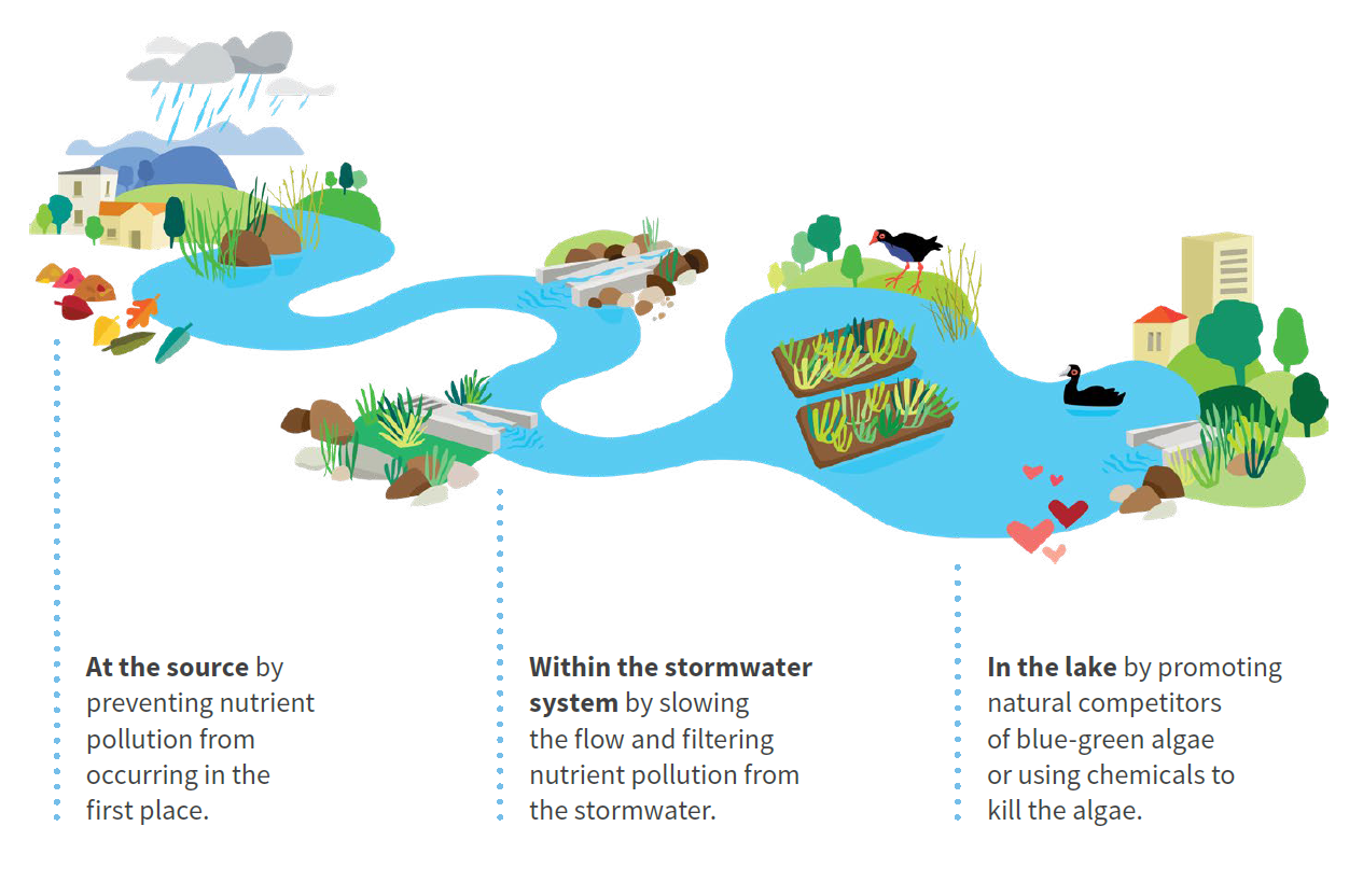 The most effective way to reduce nutrients in the lake is to prevent nutrient pollution at its source, that means preventing fallen leaves, fertiliser, grass clippings and soil from getting into stormwater drains in the first place from gardens, driveways and roadside verges.